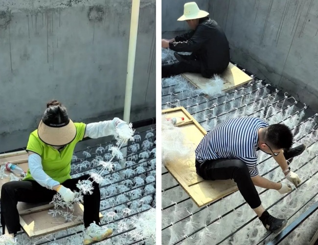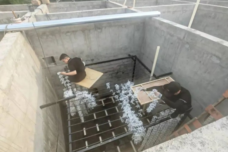 在鋼架焊接工作收尾后,緊接著的填料綁扎成了搶工期的關鍵。這些密密麻麻的填料是污水處理的“主力軍”,需要手工逐一固定在鋼架上,工作量大且要求細致。公司當即決定:全公司總動員,所有人前往施工現(xiàn)場,進入池內協(xié)助綁填料。
