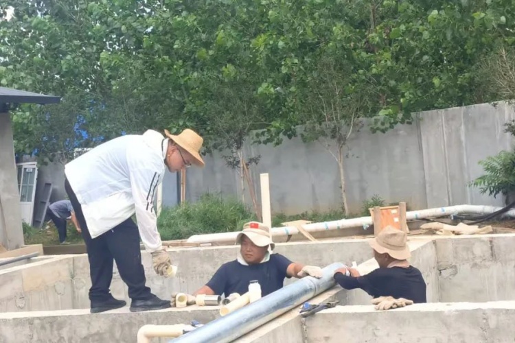 填料綁扎完成后,工程部便進入了最后的沖刺。他們在池內池外鋪設水管、連接電線,讓設備真正“活”起來。